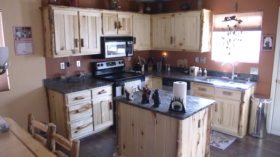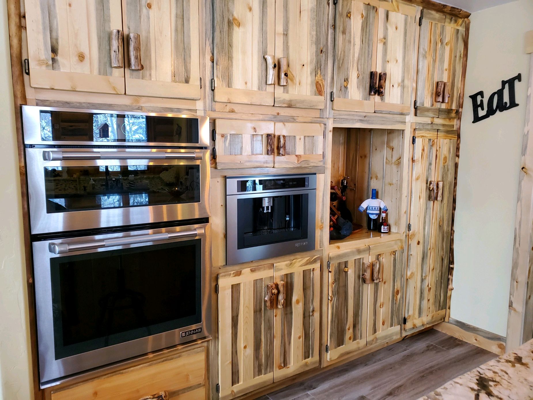 Hinged doors on the lowers hide adjustable shelves and a space for the refrigerator. The uppers feature four glass-panel doors and a space for the big screen. The wall adorns a lovely five-foot etched glass mirror complete with a rendition of the client’s golden retriever. The barstools are beetle kill pine and aspen log. They feature arms and of course heavy duty swivels.
